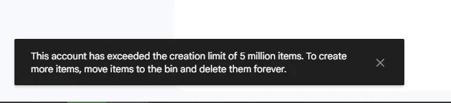 This account has exceeded the creation limit of 5 million items. To create more items, move items to the trash and delete them forever
