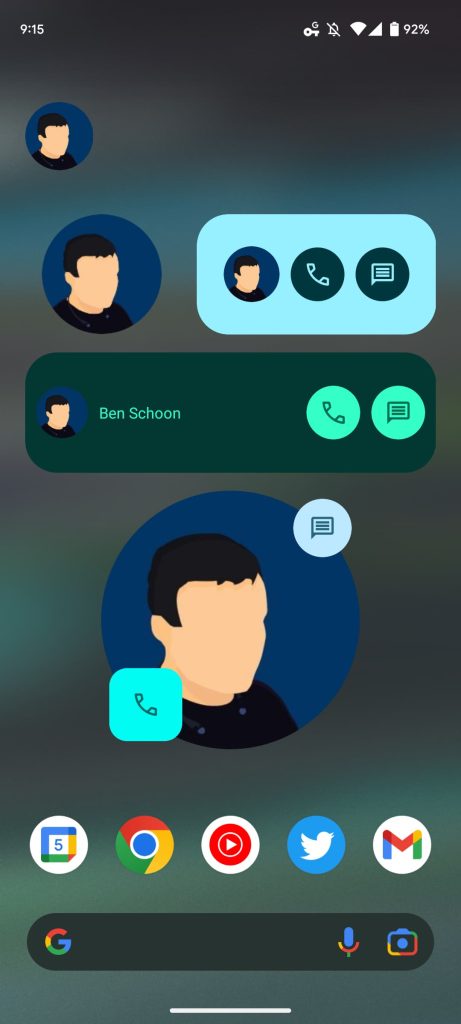 There are two basic shapes, starting with a circle flanked by a rounded square calling shortcut and a circular text button. If you decrease the height to one and have the width be at least three, Google Contacts uses a bar design that includes the name. The various elements respond to Dynamic Color theming with the various sizing options and permutations quite fun to customize.