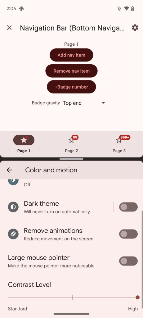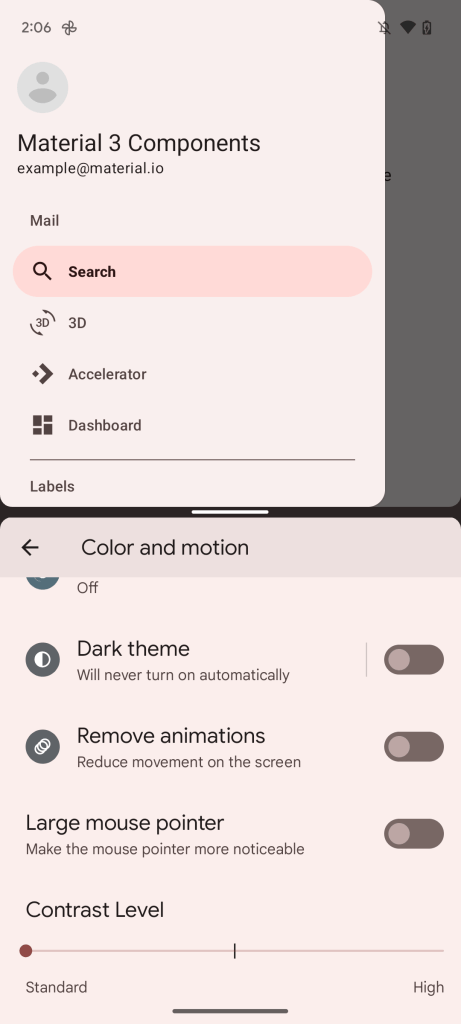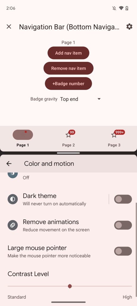 Weirdly enough, the slider doesn’t seem to affect the design or colors of Android itself, as turning up the contrast to the middle or highest settings causes no obvious changes. Despite that, certain apps built for Android 14 do respect the increased contrast levels, as seen below in Google’s Material Design Catalog demo app.