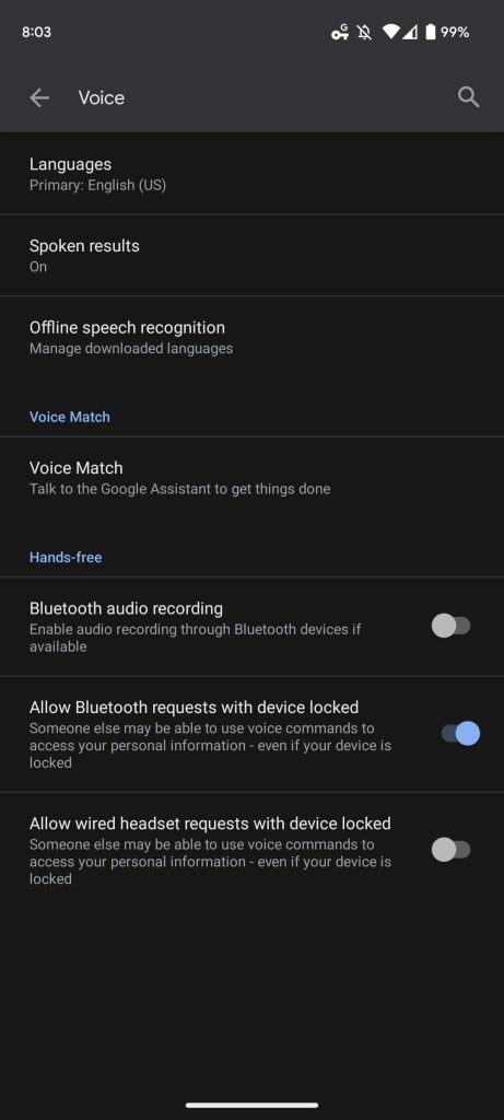 - Allow wired headset requests with device locked: Someone else may be able to use voice commands to access your personal information – even if your device is locked