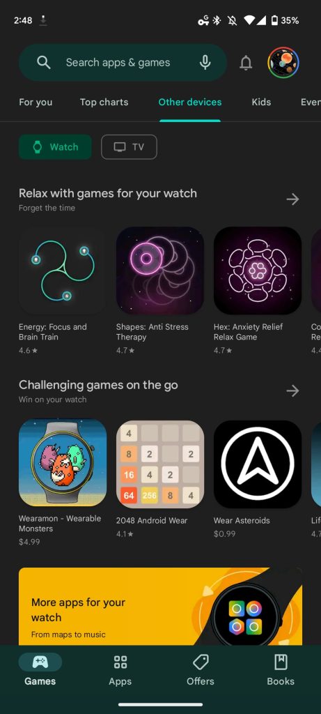 Go to the Play Store’s Games feed and navigate to the “Other devices” top tab, located after “For you” and “Top charts.” Originally, Google only showed the “TV” category, but “Watch” now appears too.