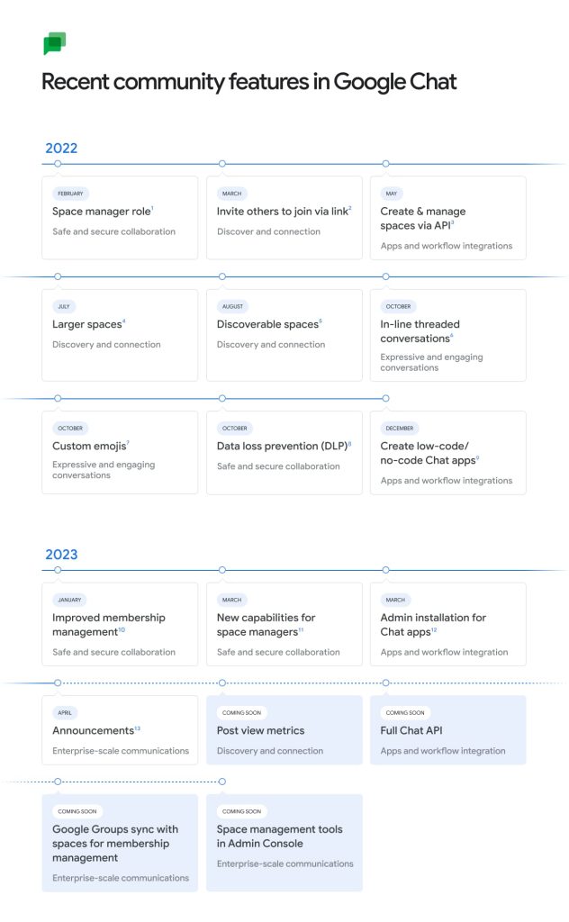 Meanwhile, the company reminded users yesterday that Google Currents (Google+ for businesses) is shutting down on July 5. Spaces, which support up to 8,000 people, in Google Chat are the intended replacement, with Google continuing its rollout of “community” features. This includes the ability to set a Space as an announcements channel. Other capabilities listed as “coming soon” include:
