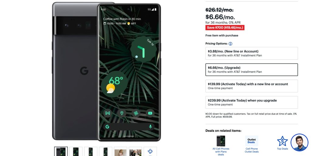 This is for a 128GB Pixel 6 Pro in Stormy Black that lists AT&T as the carrier. No other carriers (or unlocked), color, size, or storage options are seeing the same deal at Best Buy. Inventory is presumably limited.