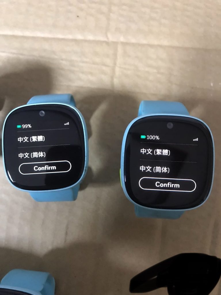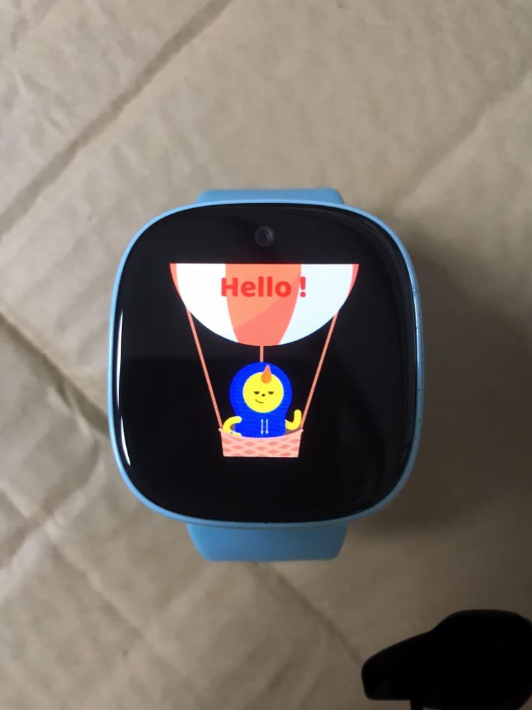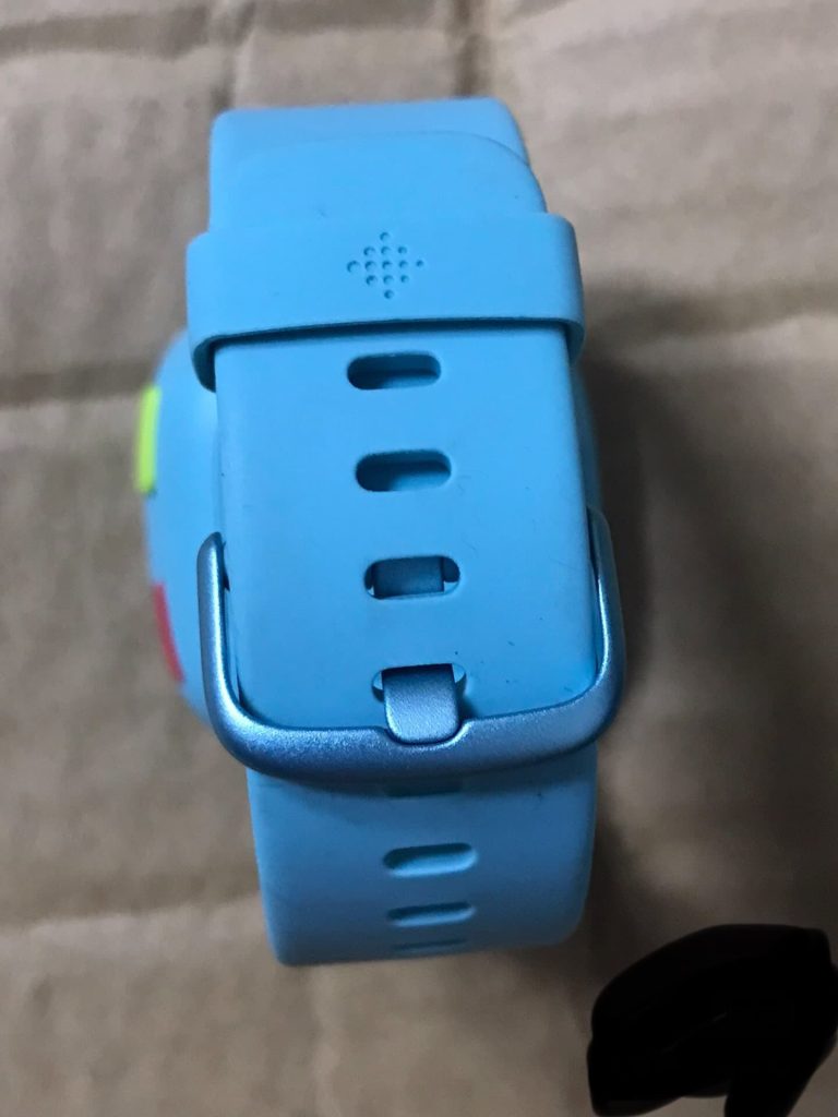 Design-wise, the kids smartwatch is essentially a bulkier and thicker Sense/Versa with a light blue case. There are buttons on the left edge, with a red-colored one at the top and yellow below. A hole for what could be the microphone is between them, while the other side has a speaker grill.