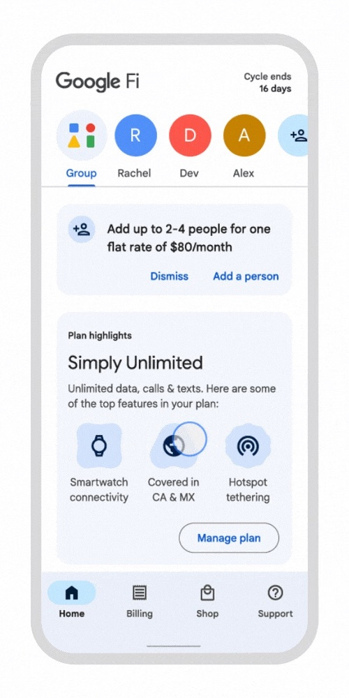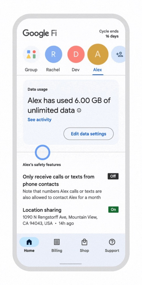 To emphasize this focus, Google Fi is getting a family-centric app redesign that makes it “easier to manage your family’s digital safety settings, such as ensuring your child can only be called or texted by trusted numbers, and giving you the ability to add new members.”