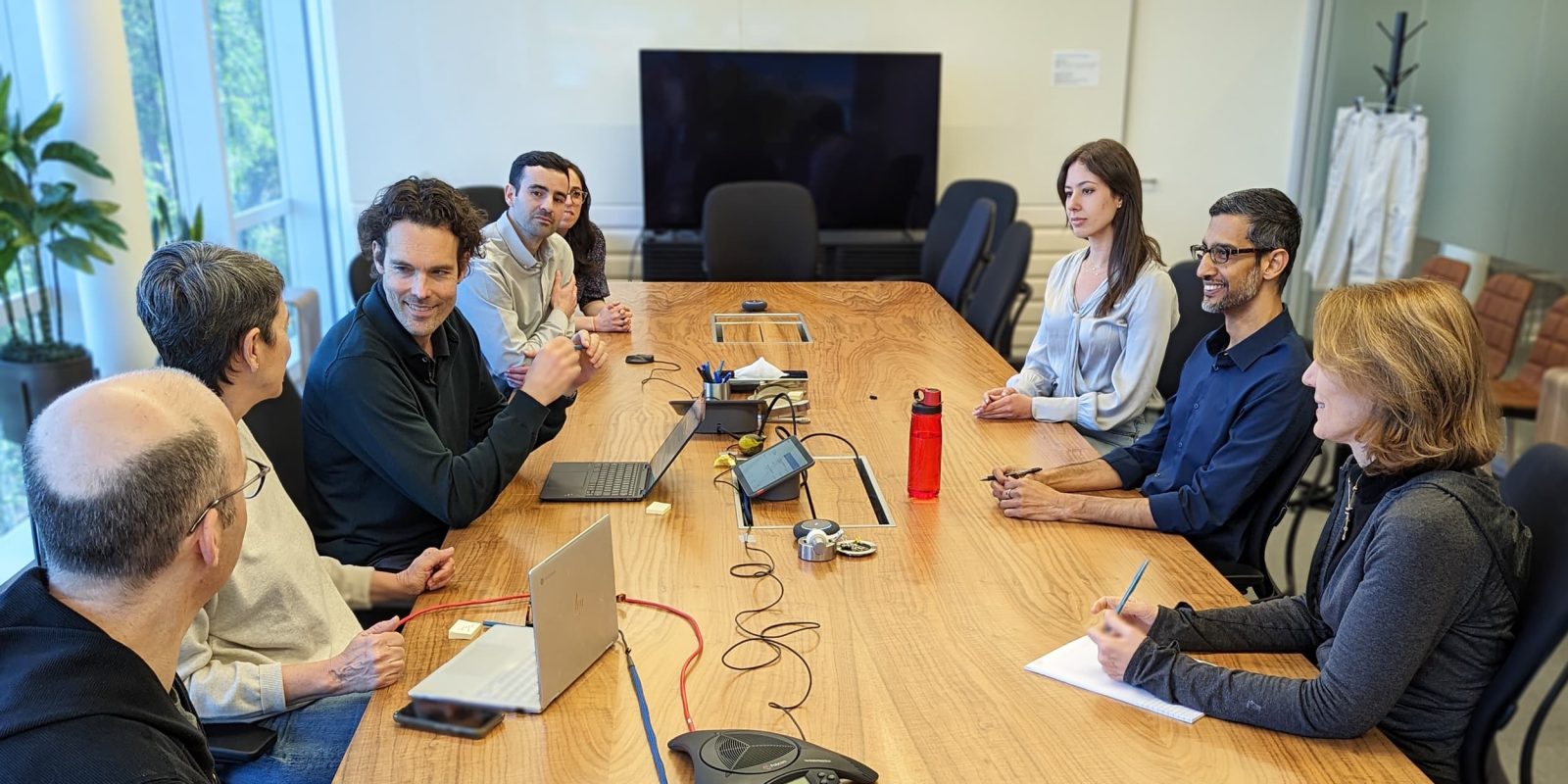 Before the keynote, Pichai tweeted a picture of the executive team getting ready for the call. The tablet at the center of the long desk is the touchscreen controller (made by Mimo) that is part of Google Meet’s Series One conferencing kit. Meanwhile, there’s a blurred device (next to the silver HP Chromebook) that might be a Pixel Fold, but it’s not too obvious. Another edit made to the picture blurs out writing on a notepad, which is par for the course.