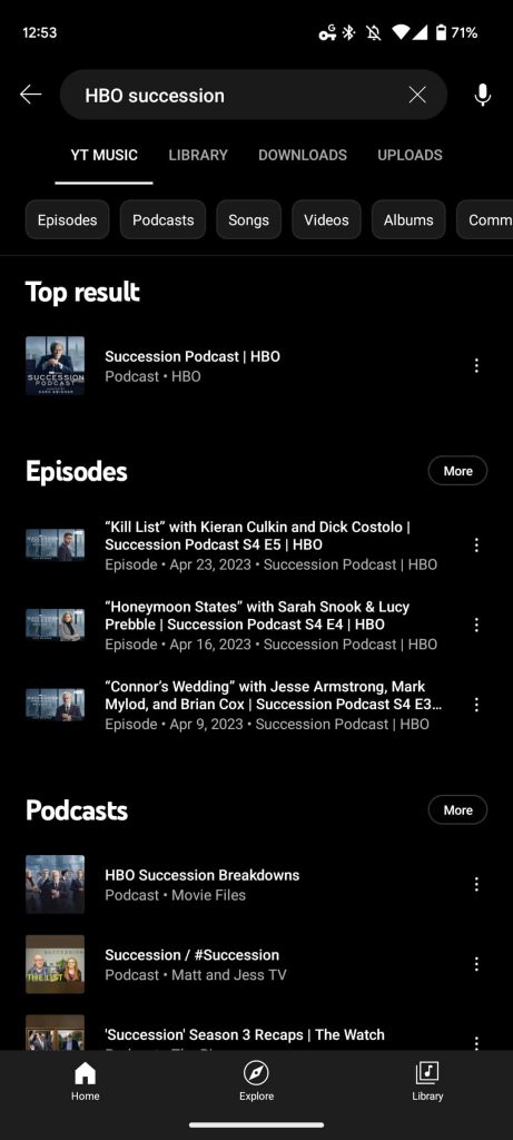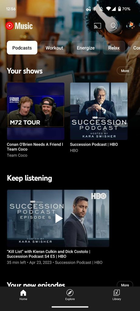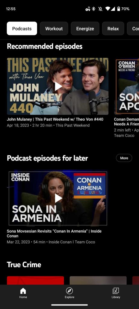 Meanwhile, Explore is home to a Popular episodes carousel, while “Podcasts” joins New releases, Charts, and Moods & genres.