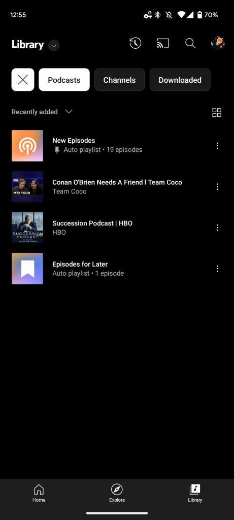 In Library, Podcasts joins the high-level filter for Playlists, Songs, Albums, and Artists. Here you’ll find two Auto playlists for “New Episodes” from shows you’ve subscribed to and “Episodes for Later,” as well as any podcasts you’ve added to your library. There are also sub-filters for “Channels” you’ve subscribed to and “Downloads,” which has a “Downloaded Episodes” auto-playlist.