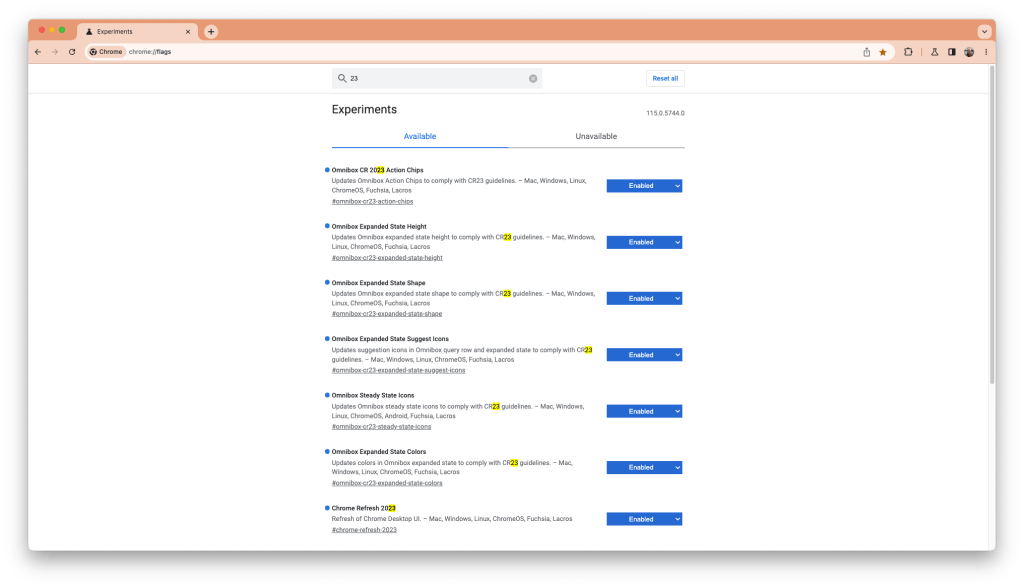 As the redesign is still actively in development, the list of flags may change over the coming weeks. Searching for “23” should helpfully surface most of the relevant flags, as seen below.