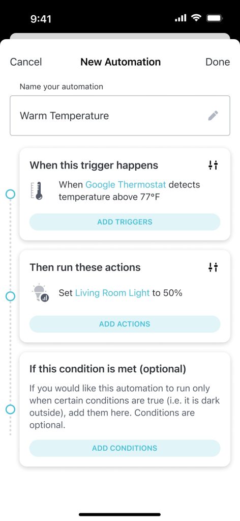 In action, this allows customers to see live video from Nest cameras in the Abode app, and use the Thermostat not only to control the climate, but even for routines in conjunction with other Abode gear. A few screenshots of the integration can be seen below: