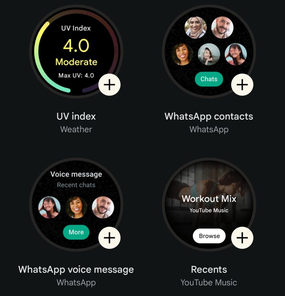 WhatsApp offers a circular complication that shows how many unread messages you have. There are also two tiles for “WhatsApp contacts” to jump to a person, while “WhatsApp voice message” lets you quickly start an audio recording. This is a pretty good embrace of first-party capabilities.
