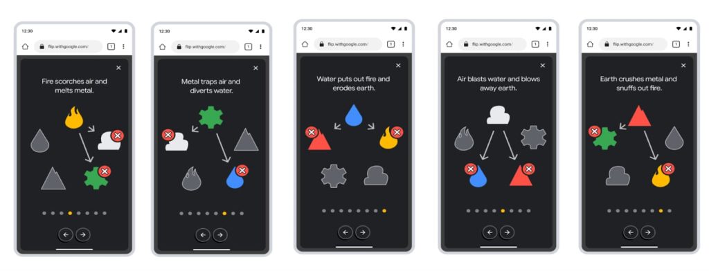 I/O FLIP is an “AI-designed take on a classic card game, powered by Google, and created to inspire developers to experiment with what is possible with Google’s new generative AI technologies.” The game mechanics feature elemental power (air, water, fire, metal, earth) and 10-100 card strength. Each match in I/O FLIP is a best-of-3. Players: