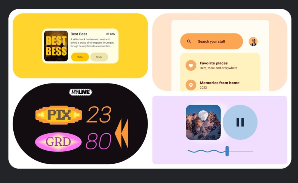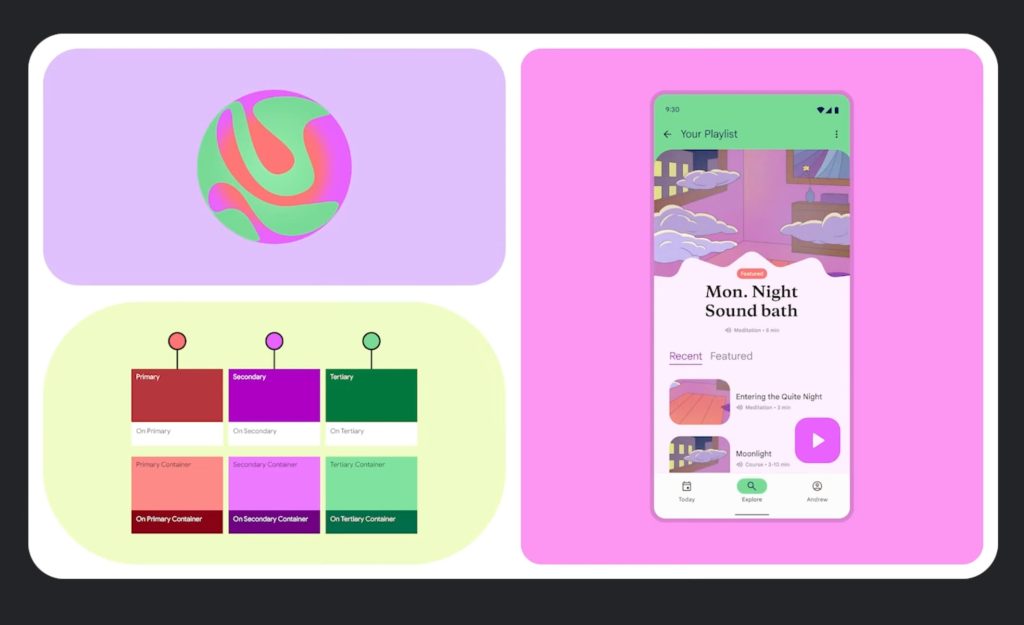 Lastly, content-based dynamic color lets buttons and other components adapt to an image shown on the screen. For example, a Now Playing page that changes color based on the current song’s album art.