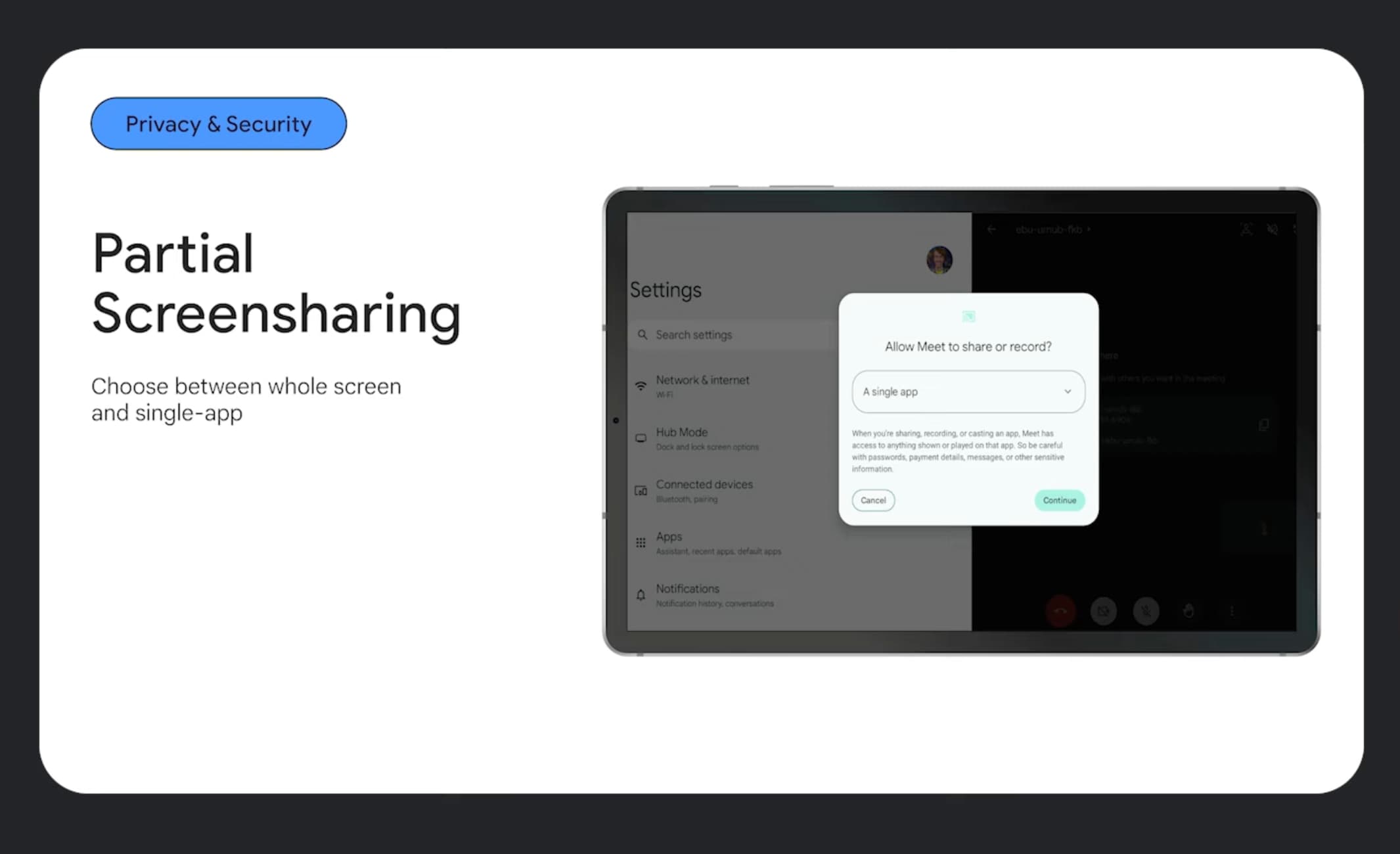 One of the more user-facing capabilities in this tentpole is partial screen sharing, which allows you to decide between single-app or whole-screen captures.