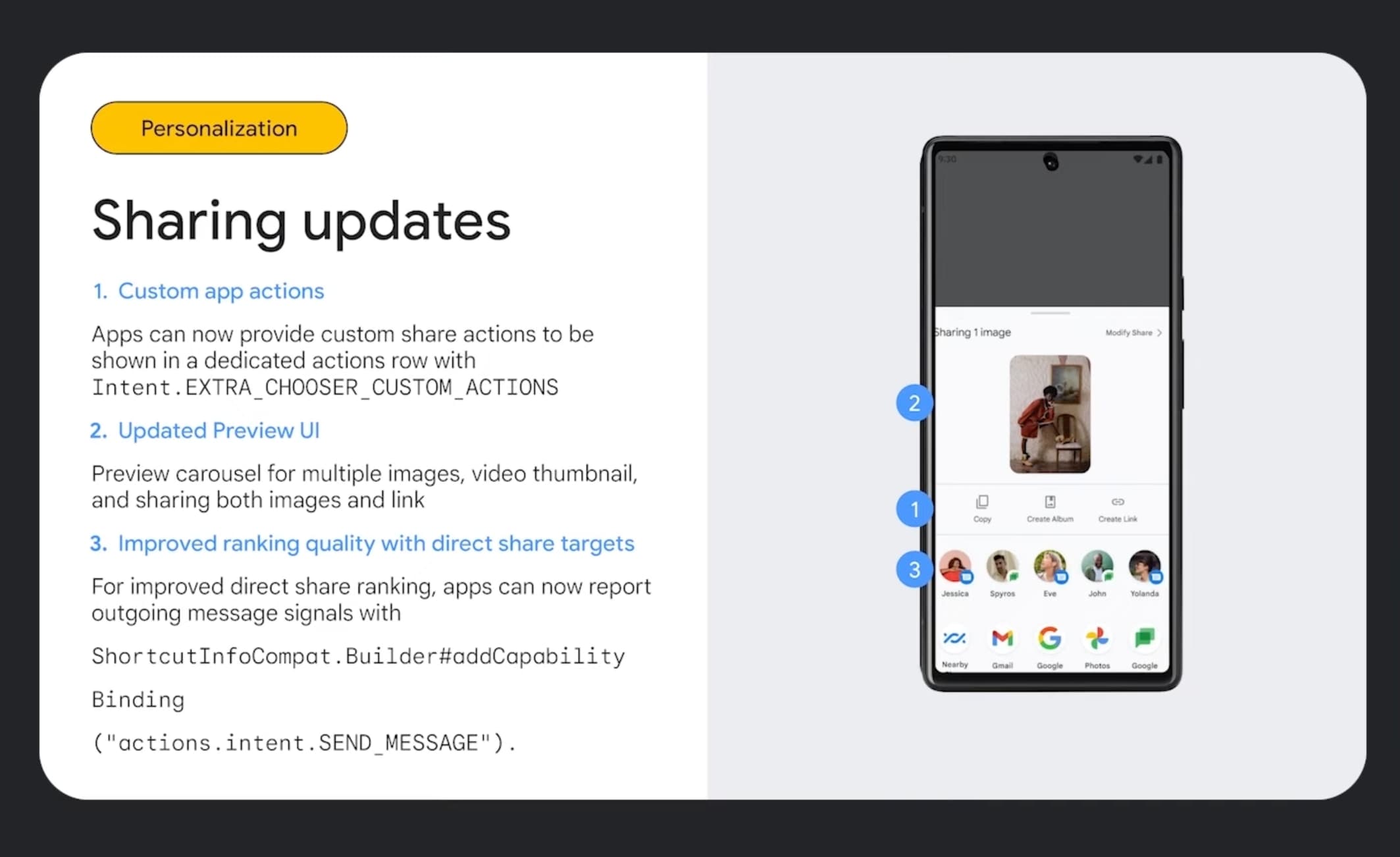 Android 14 updates the share sheet with custom app actions defined by developers, while an updated Preview UI adds support for video thumbnails and multiple images via a carousel. Lastly, direct share targets can be better ranked.