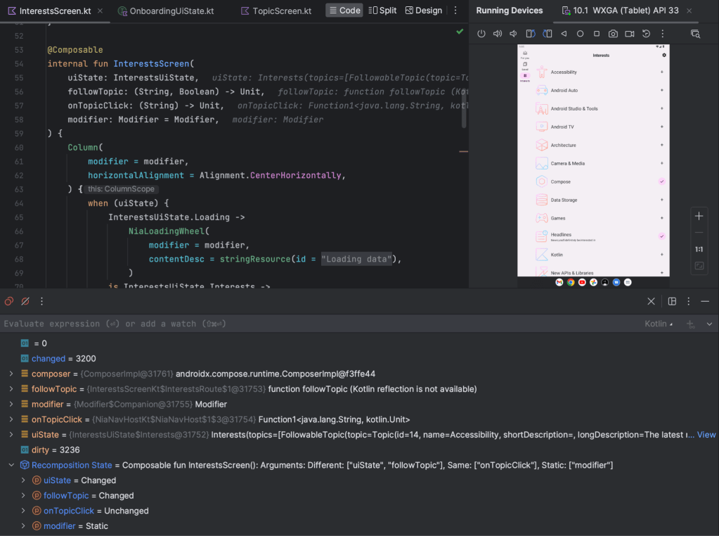 For Jetpack Compose developers, when debugging Compose UI code in Android Studio, you’ll now get more information about the parameters of your Composable functions. This will make it easier to understand what parameters changed and caused your app to recompose.