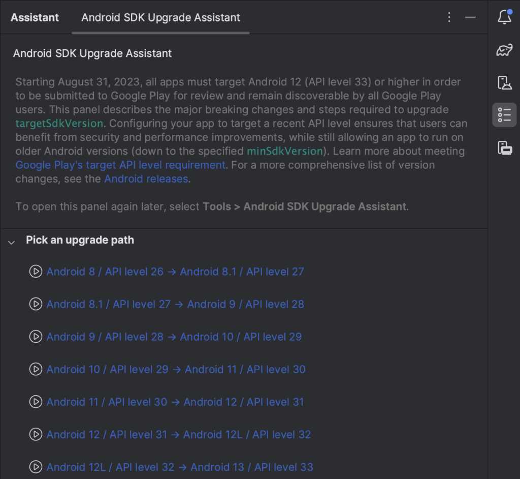 In Android Studio Giraffe and newer, you can find a new “Android SDK Upgrade Assistant,” which walks you through the changes you need to make to upgrade your app to a newer version of Android. As the Google Play Store – and, more recently, Android itself – has been gradually increasing its minimum API requirements, this tool will surely become invaluable.