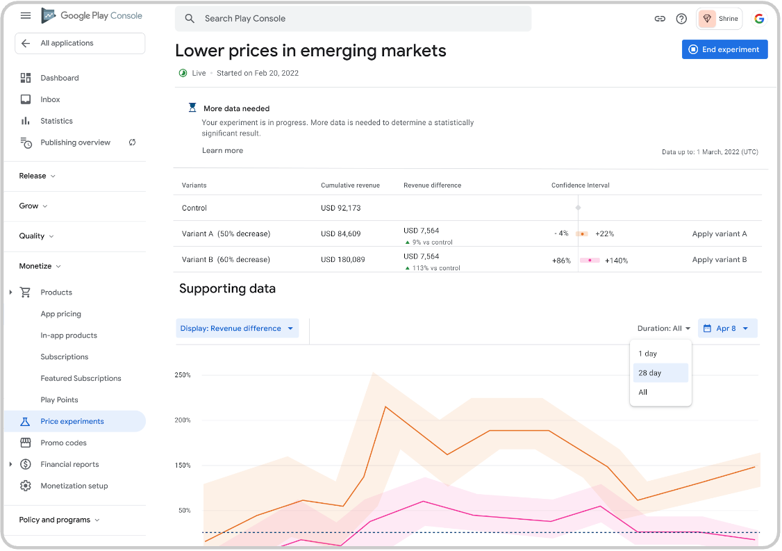 The Play Console will now feature a new “Price Experiments” feature that allows you to run tests to see if a particular price tag is any more or less effective at driving sales. Similarly, an app’s listing in the Play Store can soon surface “featured products.”