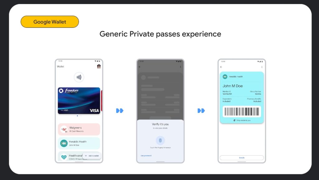 The Generic Pass API allows developers to use Google Wallet for gym memberships, auto insurance, reservations, and parking. Google is now adding a Generic Private Pass API to allow for health insurance and ID cards that contain sensitive information.