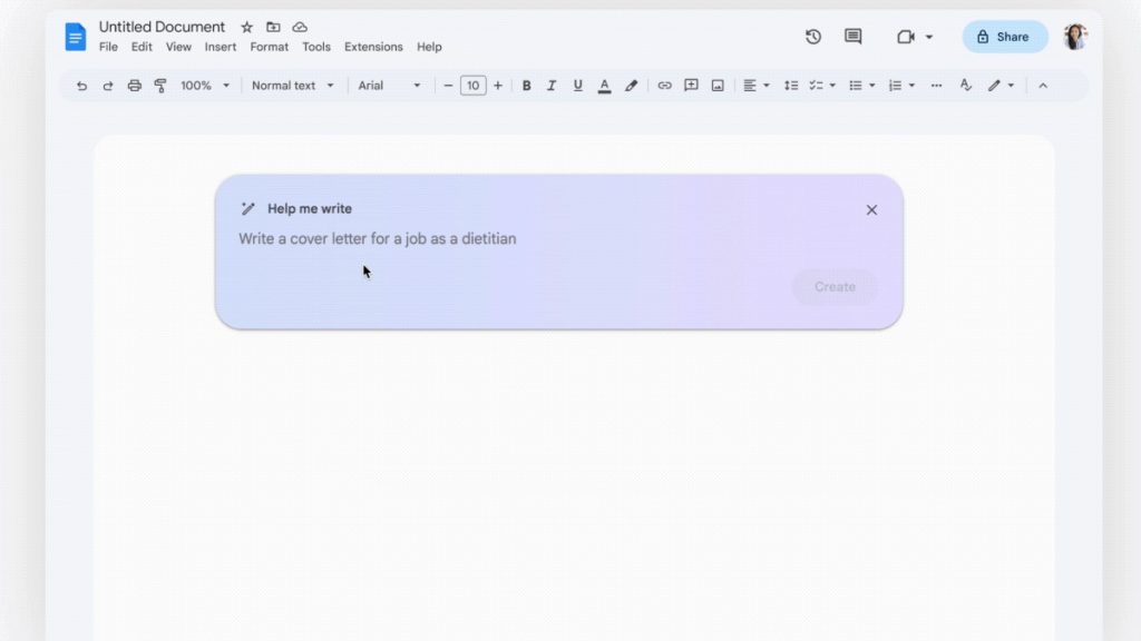 In Google Docs, opening a new page shows a “Help me write” chip. It’s the same workflow as Gmail, but the “Help me write” button can be found to the left of your cursor on the edge of the page to access it again.