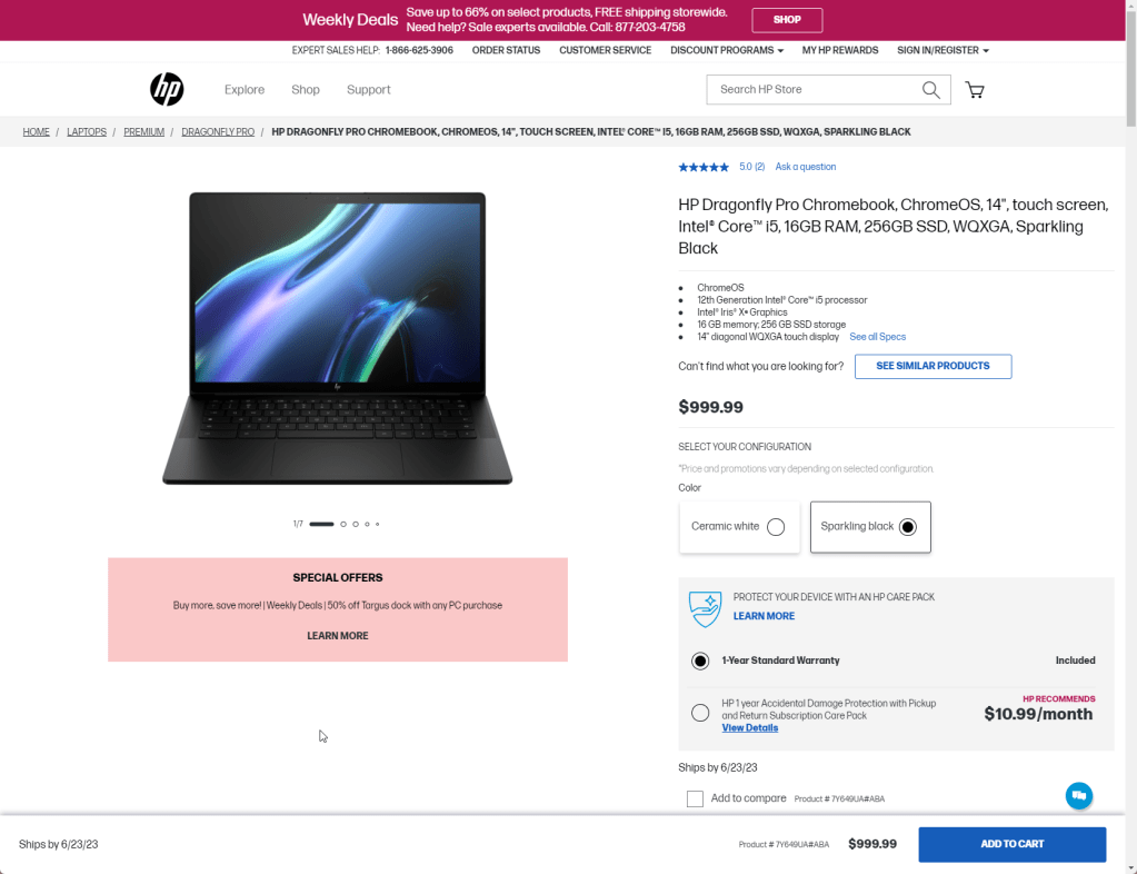 At HP.com, currently the only place to buy the Dragonfly Pro Chromebook, HP has brought back stock of the “Sparkling Black” model of the laptop. The “Ceramic White” model is still not available for purchase.