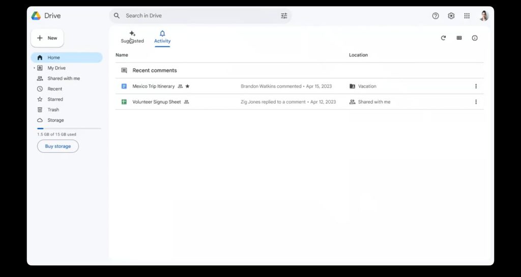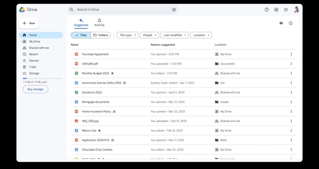 You’ll see two feeds at the top. “Suggested” is where Google Drive will offer documents that might be relevant to you. A “Reason suggested” column explains why something was recommended. For example, it might be because you or another user recently opened, uploaded, or edited with a time/date included. Google will also note the location of the file.