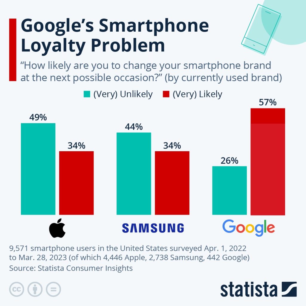 Statista reports this past week as a part of its Global Consumer Survey that a whopping 57% of Google Pixel owners surveyed said they are very likely to switch to a different smartphone brand at the “next possible occasion.” A mere 26% were “very unlikely” to switch.