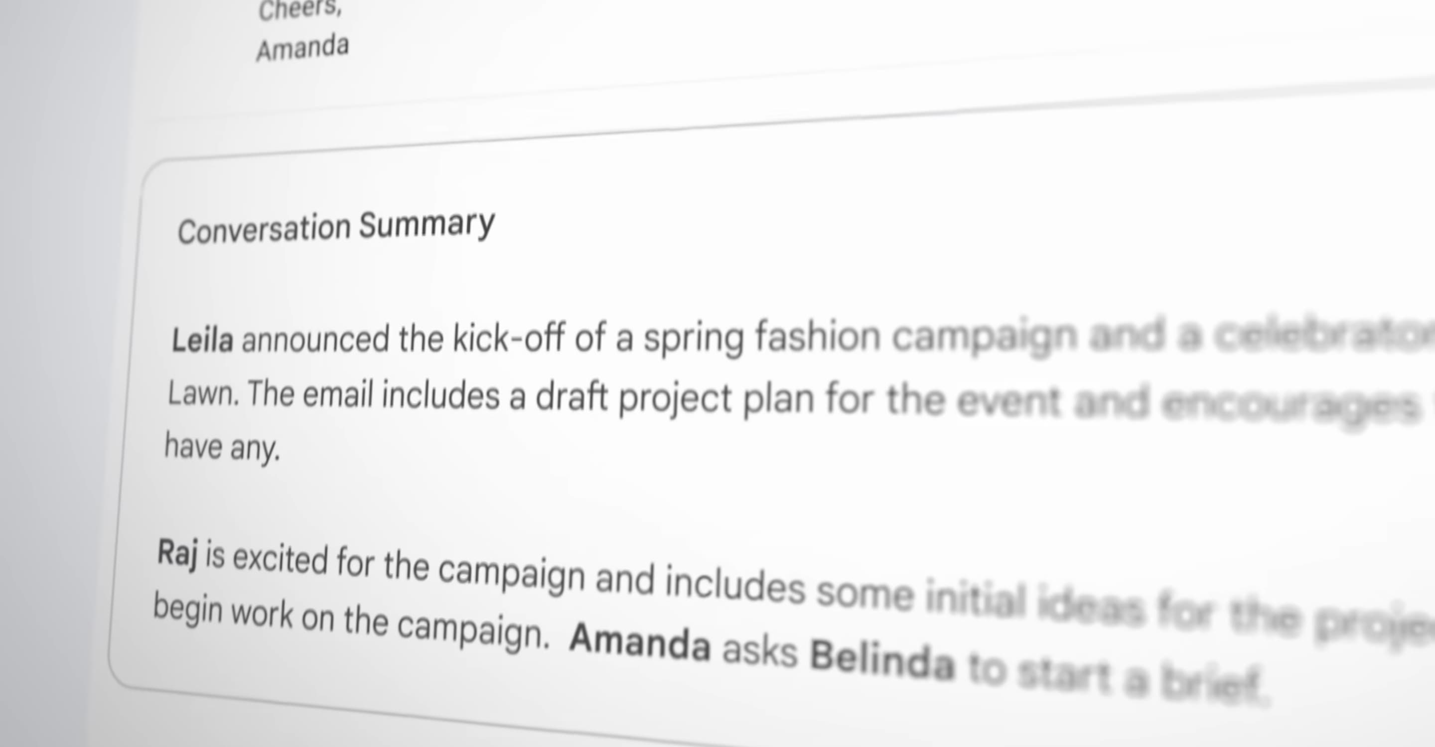 In Gmail, generative AI is meant to help you “communicate faster with just the right words to express yourself.” Bullet points here include “Summarize threads” and “Organize your inbox.” The former capability has been shown off in a demo video (seen below), while it’s unclear what the latter will look like. Today, Google offers a standard view and auto-grouping “Categories,” like Promotions, Social, Updates, and Forums.