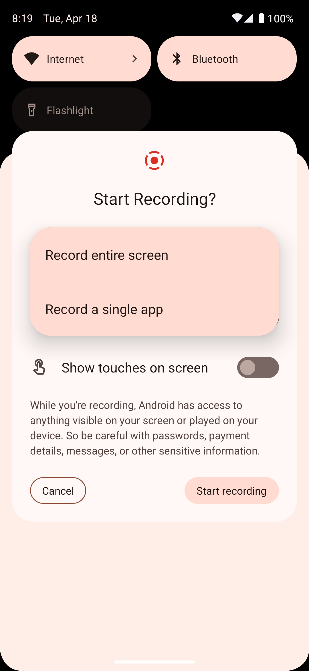 When the screen recording menu in Android 14 is accessed, it shows the option to record the “entire screen” or just “a single app.” If you pick the latter, you can then pick from any app on your device or those which have recently been opened up. When an app is chosen, recording begins and Android will automatically block all system UI elements from the recording. This includes swiping down for notifications, as well as seeing notification previews, the time, and more.