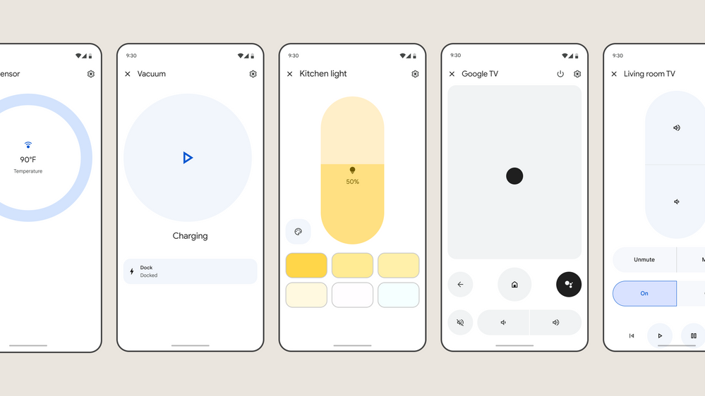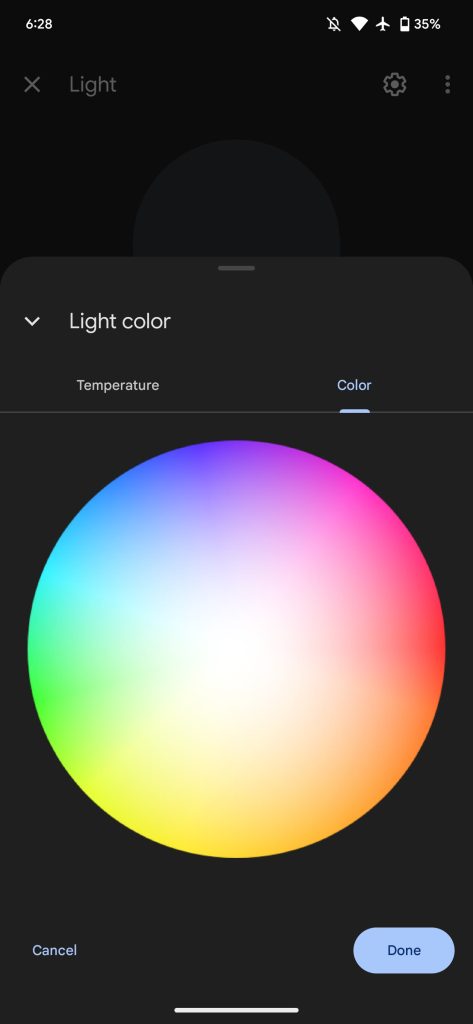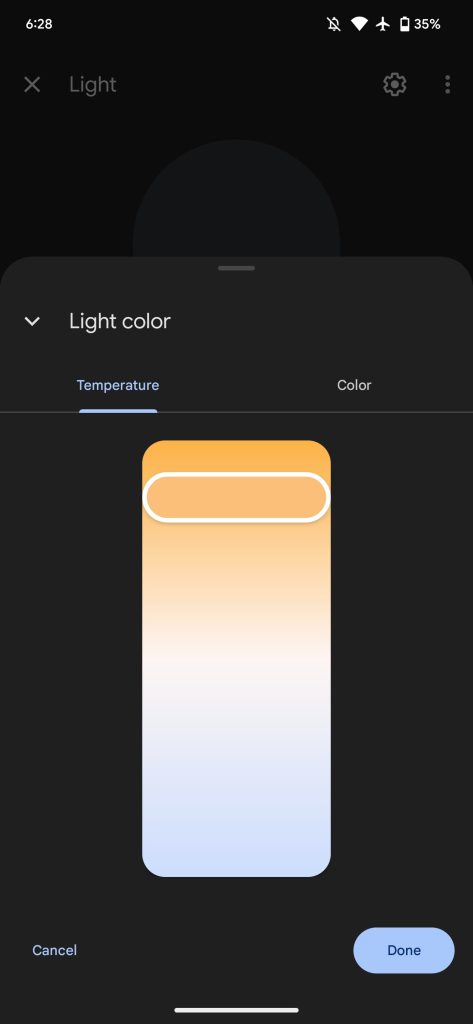 Below that are six quick temperature options, while the Light color FAB brings up a new sheet. The first tab shows a bar to control temperature, while you have a circular color picker in the next tab. These two features are already live in the Wear OS app and will be available on the phone/tablet client over the coming weeks.