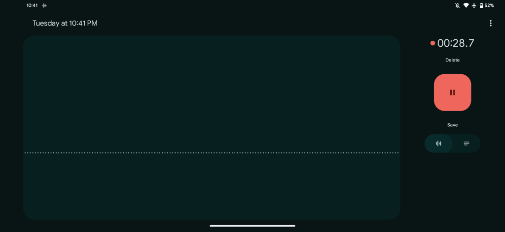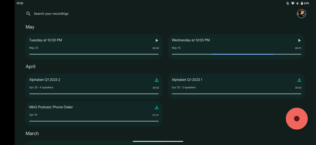 Recorder’s previous tablet UI was just the landscape mode for phones. On the homescreen, there’s now a two-column layout for your saved recordings, while the large FAB is now in the bottom-right corner instead of being centered in what was essentially a dedicated column for that button.