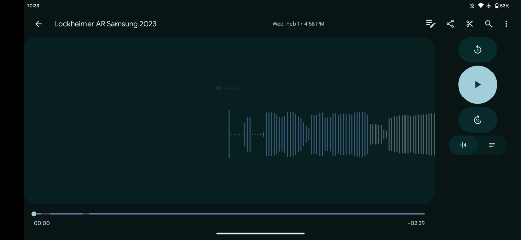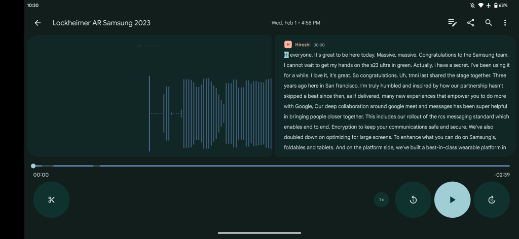When viewing a recording, Google will show both the waveform and transcript side-by-side instead of having to choose one or the other. This is similar to the recorder.google.com layout on the web, which just got a Material You redesign. Playback controls have been moved to the bottom corner and are now side-by-side instead of being stacked. There’s also now a large button for editing, which has been similarly optimized, in the left corner.