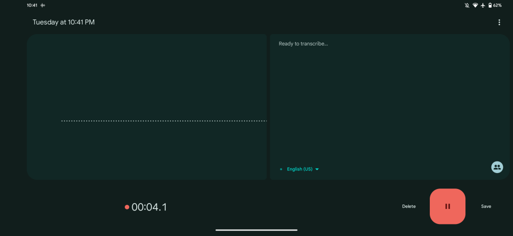 Lastly, the recording UI switches to the same dual-column layout for the waveform and transcript, as well as buttons. The time has also been moved to the bottom-left.