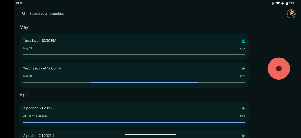 Version 4.2.20230427.530752515 (versus 4.2.20230419.x) is rolling out now via the Play Store. Since the Pixel Tablet and Fold aren’t here yet, you can test out the Google Recorder updates by boosting DPI in Developer options to 600+ for a rough approximation as seen above.