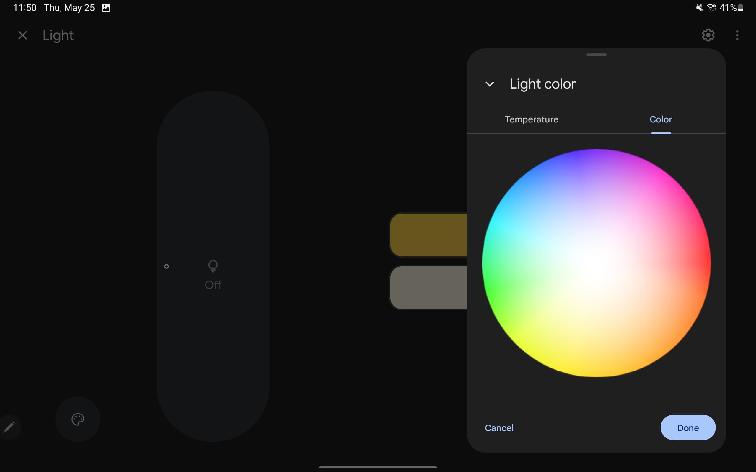 The brightness arc is replaced by a slider in the shape of a pill with six quick temperature options below. A lighting FAB brings up a new sheet with two tabs. The first shows a strip to control temperature, while you have a circular color picker in the next tab.