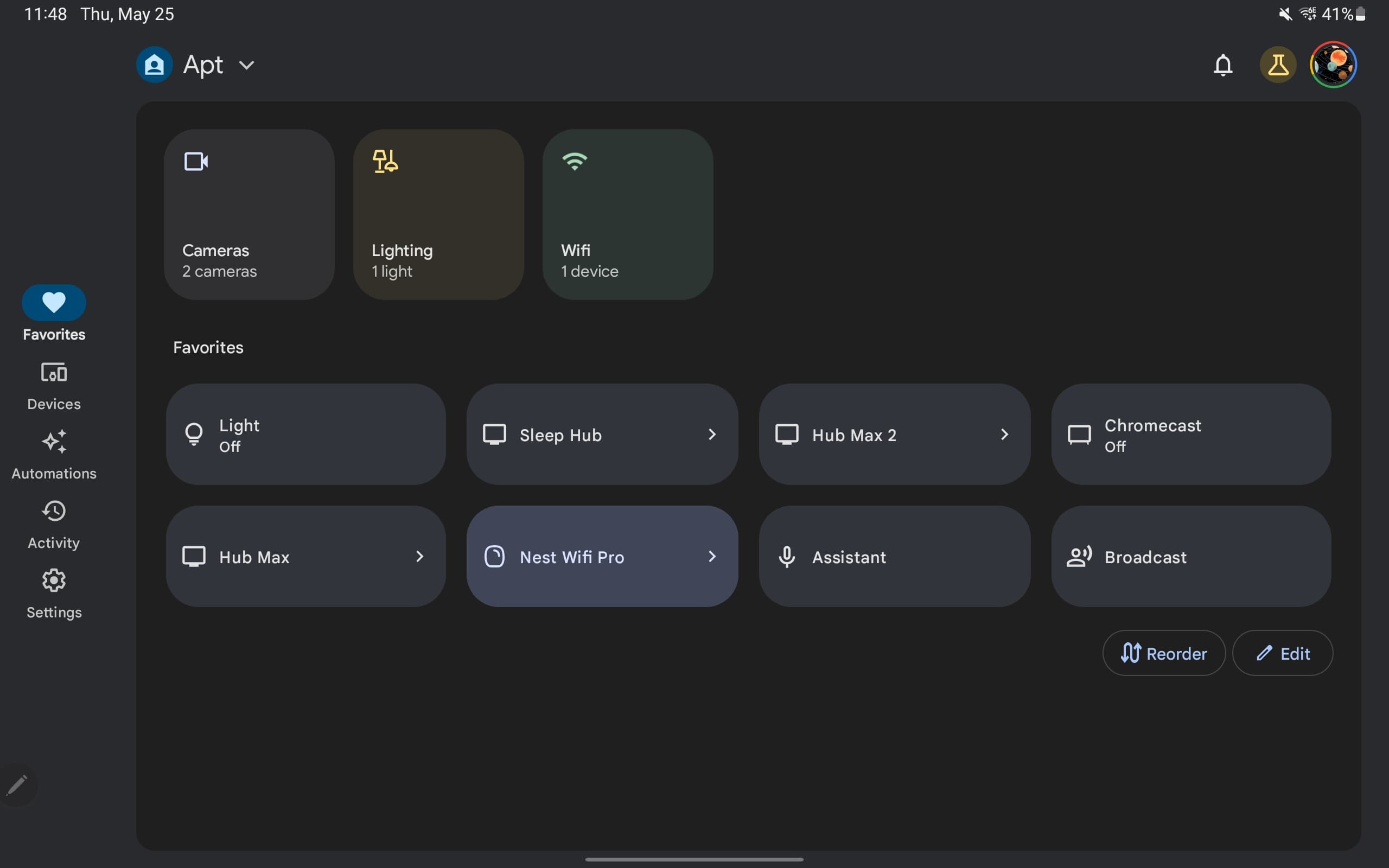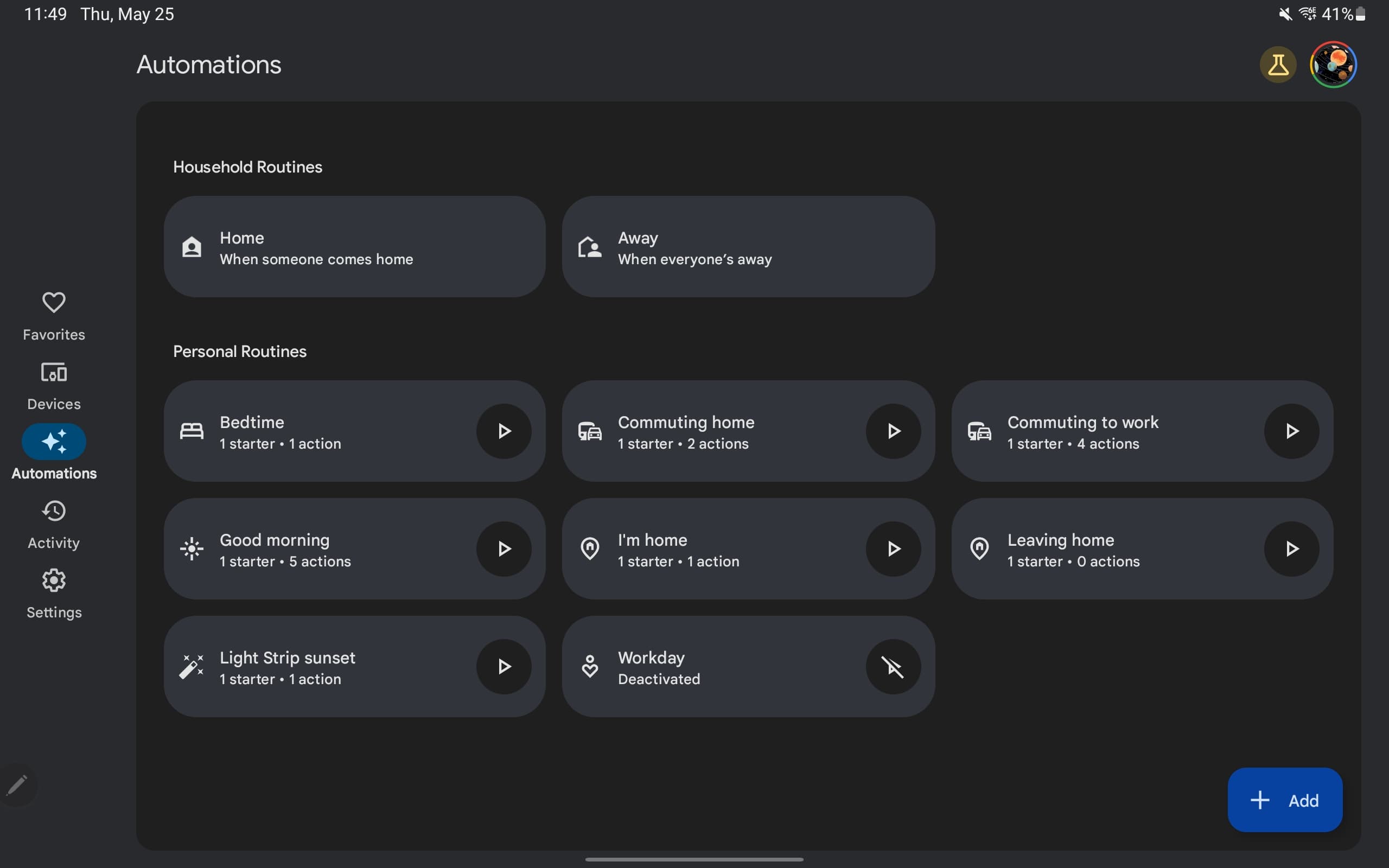 On tablets, the contents of each tab – Favorites, Devices, Automations, Activity, and Settings – are now placed in a new container with rounded corners that’s distinct from the navigation rail and top app bar. The latter components are displayed against a different background (light blue when the dark theme is disabled).