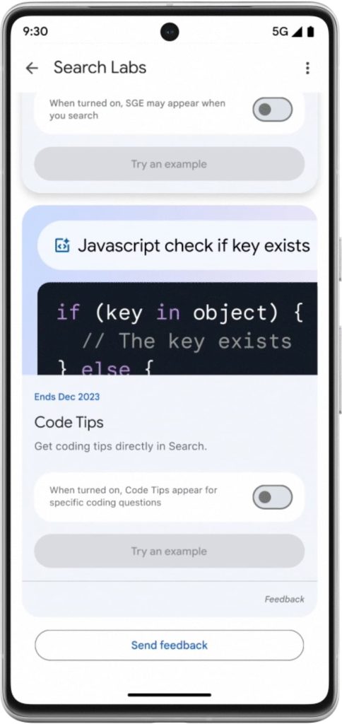 - “Code Tips harnesses the power of large language models to provide pointers for writing code faster and smarter. You can ask how-to-questions related to a specific set of programming languages (C, C++, Go, Java, JavaScript, Kotlin, Python, TypeScript), tools (Docker, Git, shells), and algorithms.”