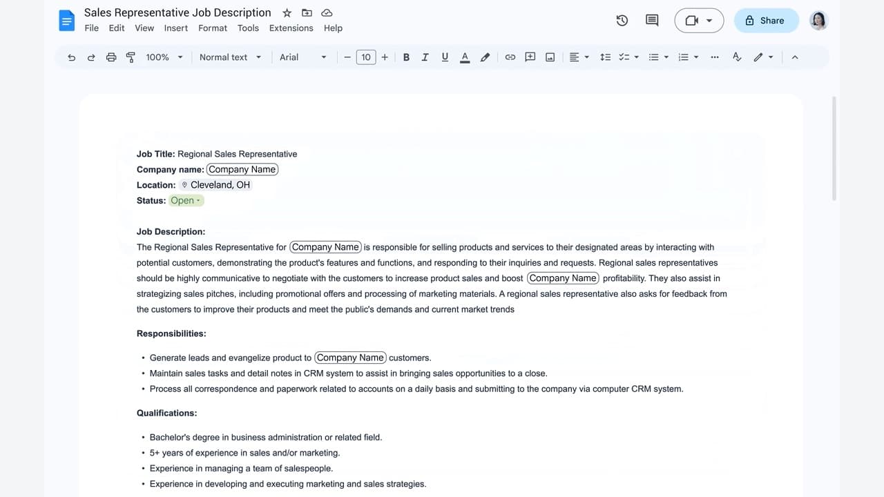 In Docs, Help me write will automatically add smart chips and other variables to a generated reply to remind you to add details, like the name of your company in a job application.