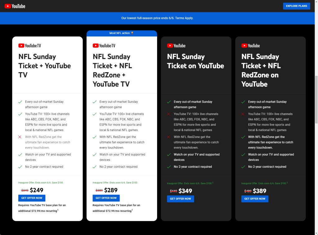 NFL Sunday Ticket on YouTube TV & NFL Sunday Ticket with NFL RedZone on YouTubeTV: $100 off Sunday Ticket, not YouTube TV base price. Offer ends 6/6. Terms apply. YouTube TV Subscription auto-renews at the then current seasonal price. Blackout [embargo] restrictions apply. YouTube TV subscription required. No refunds