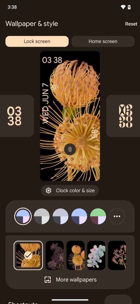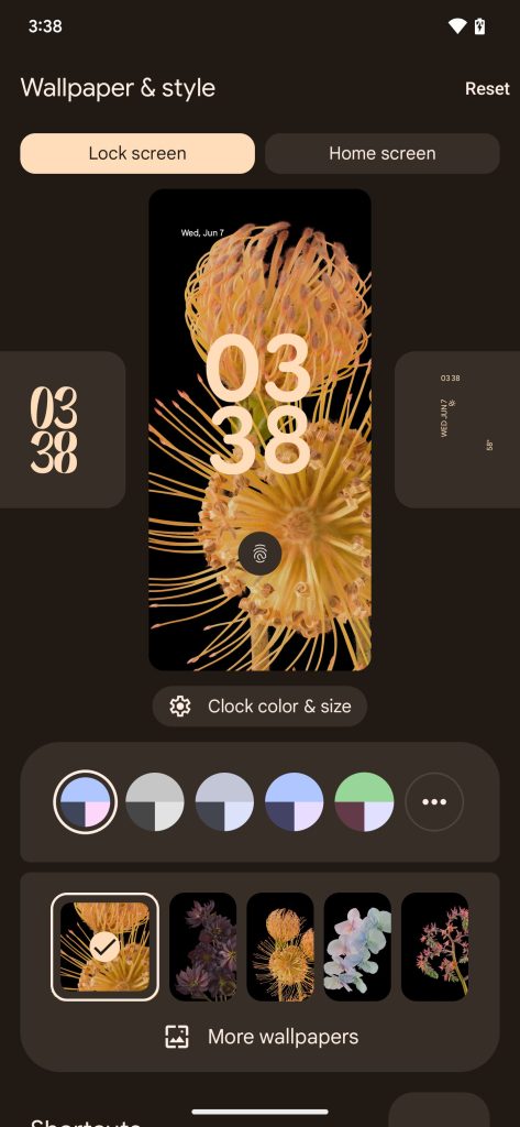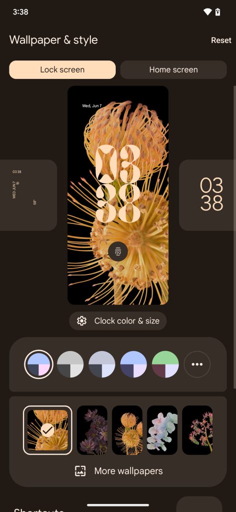 The UI for Wallpaper & style has been updated with tabs for “Lock Screen” and “Home Screen” at the top. In the first page, you’ll see a “Clock color & size” button below the preview.