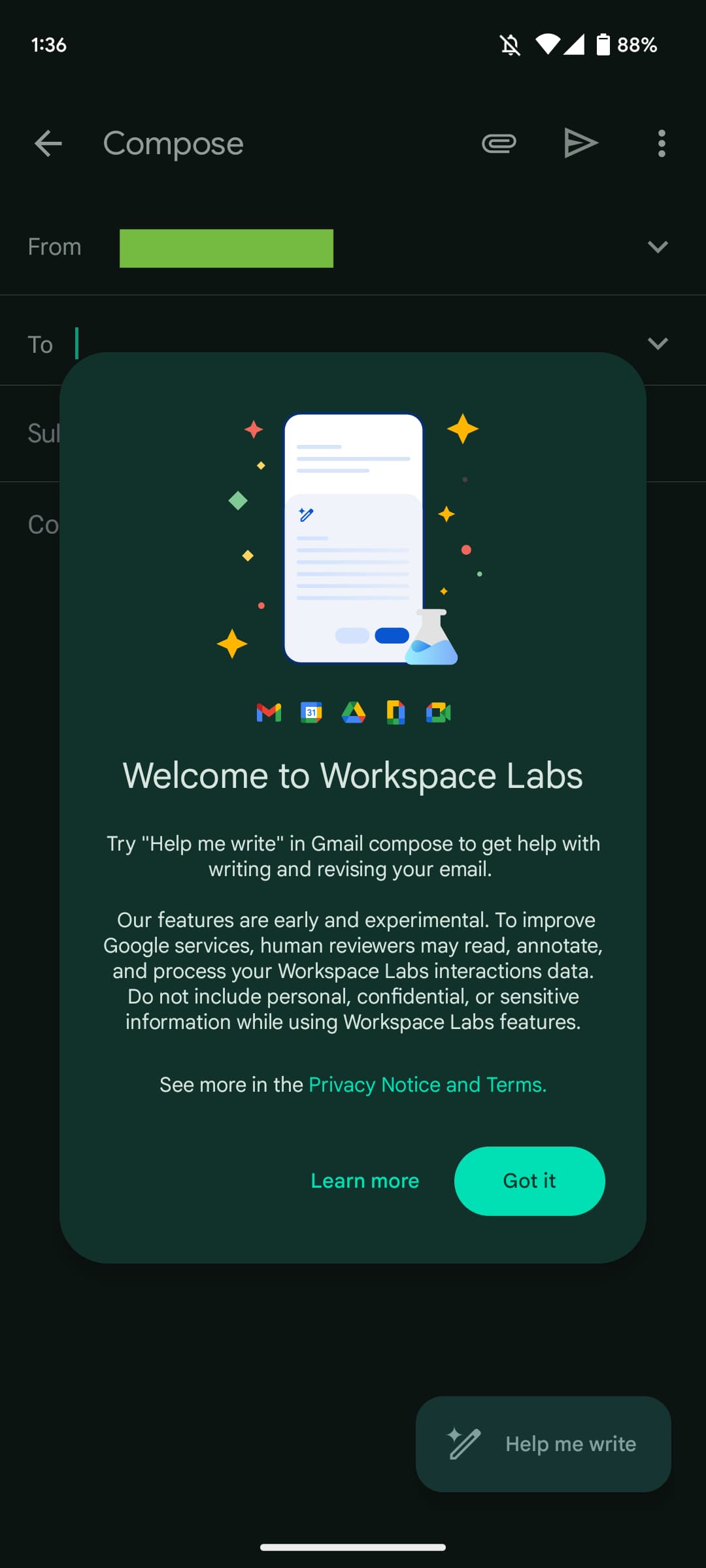 As of this afternoon, we’re seeing Gmail’s “Help me write” tool widely rolled out for those enrolled in the Workspace Labs program on Android and iOS. We’re not yet seeing it in the Google Docs mobile apps.