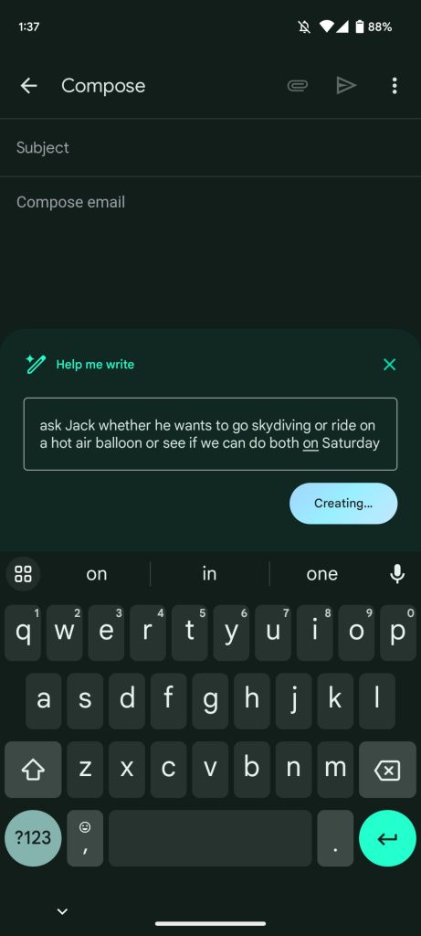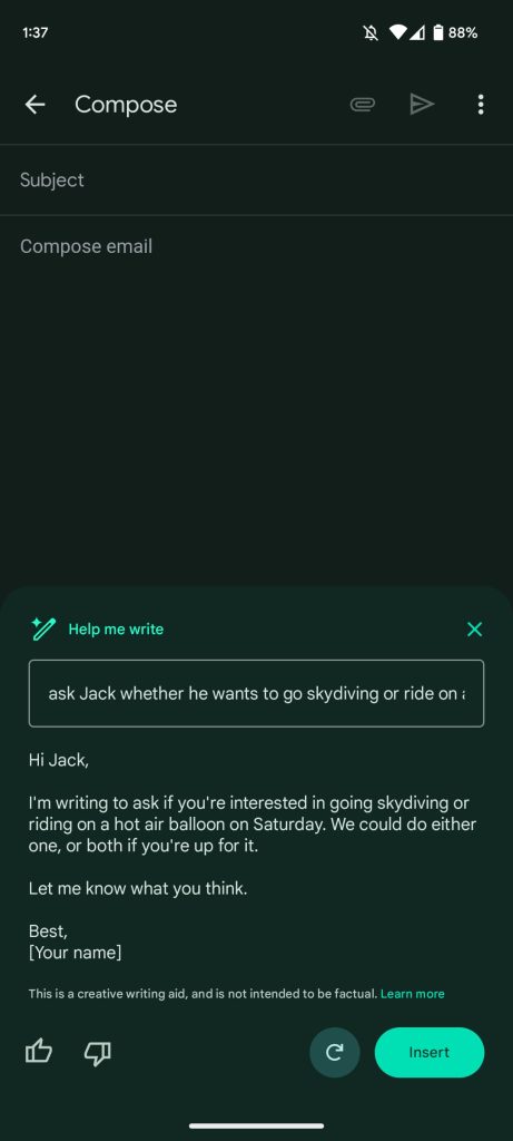 Like on the desktop app, you’re first greeted with an introductory prompt for generative AI. Afterward, a “Help me write” button will appear in the bottom-right corner. Tapping lets you enter a prompt, with the “Create” button featuring the blue/purple wave as it works. You can generate a new one and leave feedback before inserting it.
