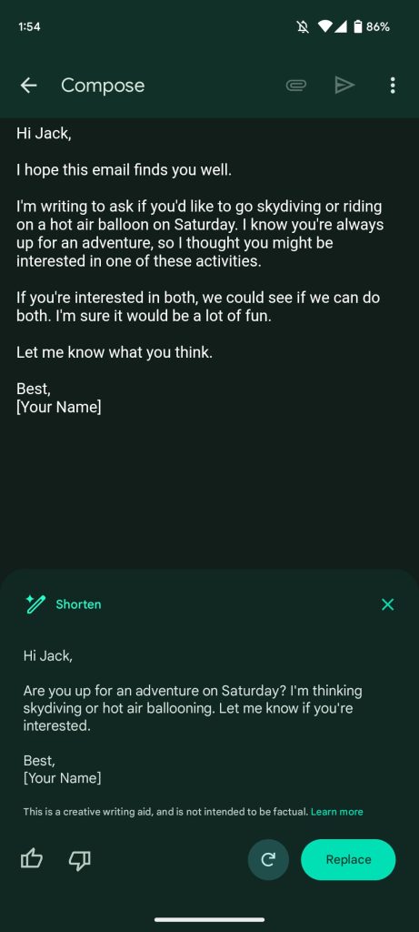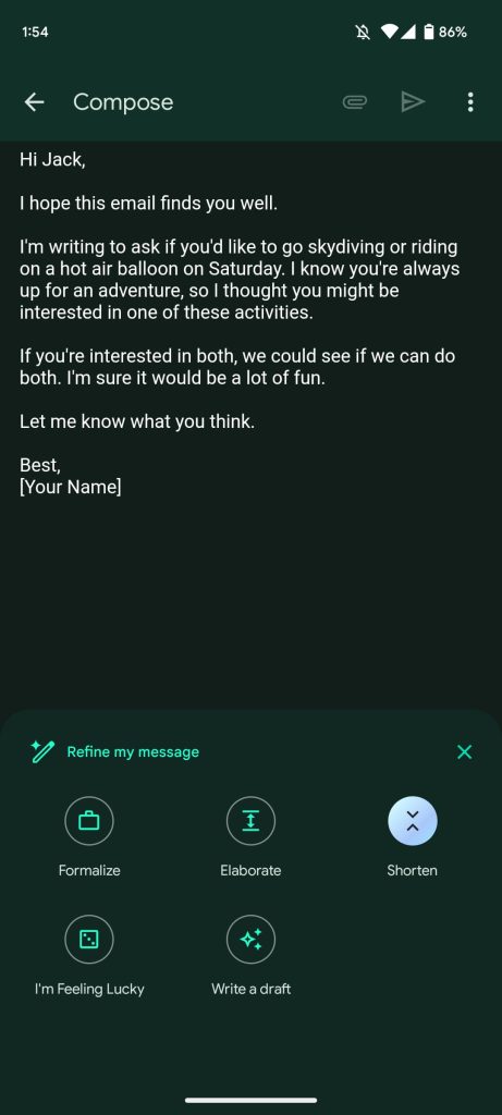 Once the text is entered in the compose feed, tapping the button again lets you “Refine” the message in a handful of ways: Formalize, Elaborate, Shorten, I’m Feeling Lucky, and Write a draft. This will take another few seconds with the icon pulsing to note progress.