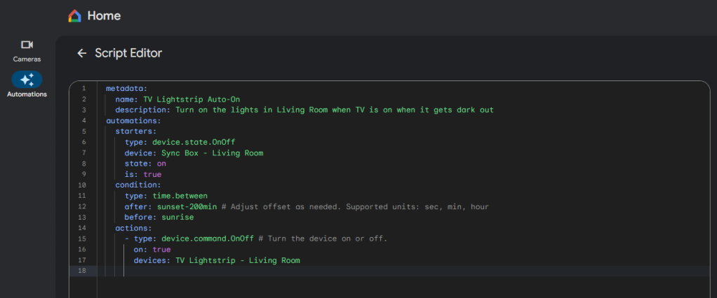 To do this, I set up a script that uses the state of my Philips Hue Sync Box (connected to my TV) as the starter. If any of my TV devices (Chromecast, Switch, etc.) turn on, the light strip will turn on. However, it will only do so if the time of day is before sunrise or a few hours before sunset. Since my house’s position leaves my living room a bit starved of natural light a few hours before sunset, I left a 3-hour window, and by tying that to the sunset, this should work year-round as the days get longer or shorter.