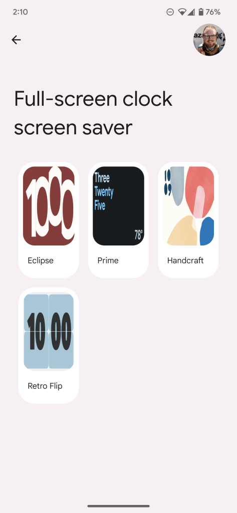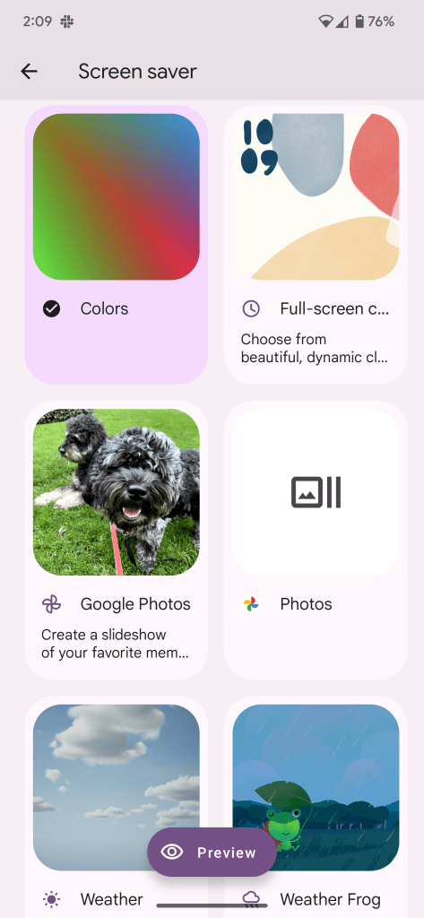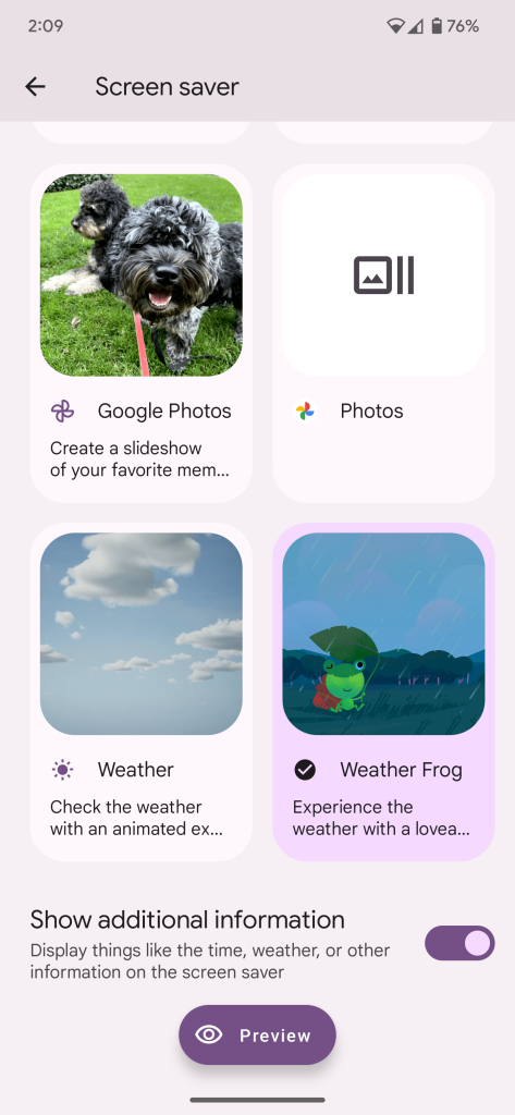 Upon installing Dreams, the screen saver menu on our tester Pixel phone gained numerous new options, including full-screen clocks, a Google Photos slideshow, and even the beloved Google Weather Frog. These options line up with what we saw during our hands-on time with the Pixel Tablet.