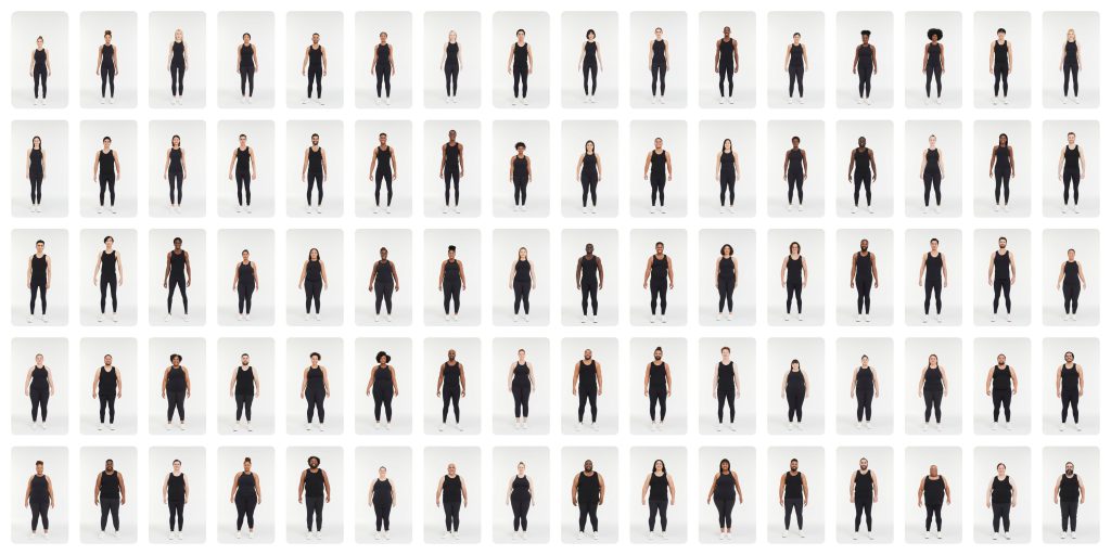 We selected people ranging in sizes XXS-4XL representing different skin tones (using the Monk Skin Tone Scale as a guide), body shapes, ethnicities and hair types.