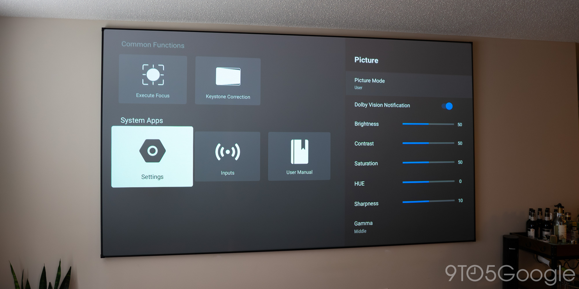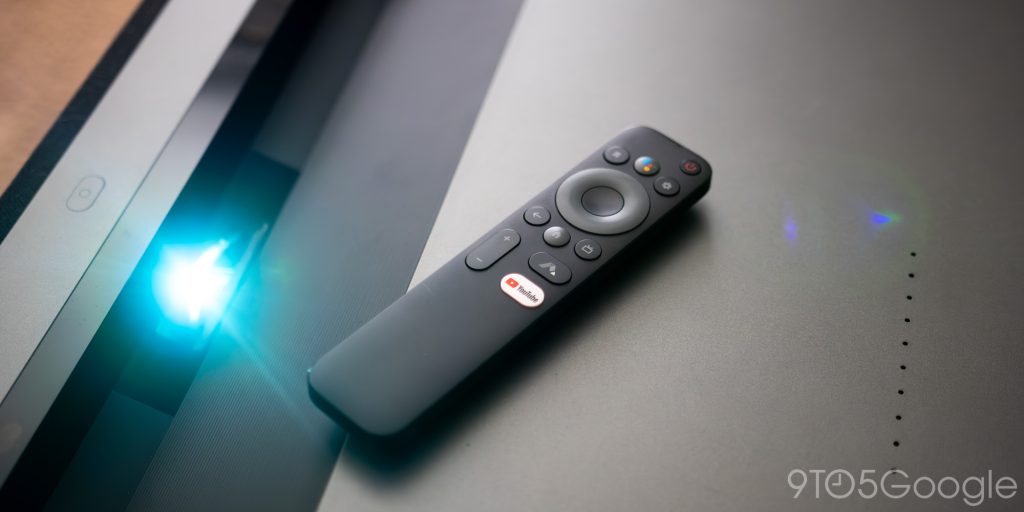 The Theater comes with built-in speakers and plays into the Google ecosystem well, with built-in Android TV. As a wonderful little touch, Formovie incorporates a small strip of four LED dots that light up when you say, “Hey, Google,” or activate the Assistant. A physical mute slider lays on the right side, which is an even nicer touch.