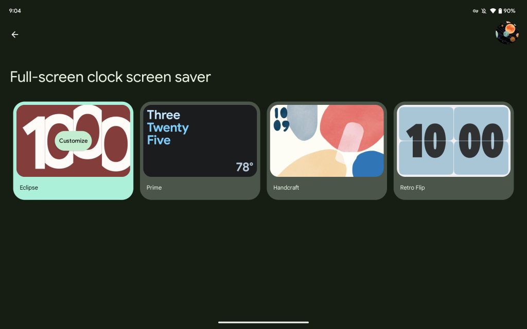Google’s selection of full-screen clock screen savers includes the sliding Eclipse, Retro Flip, and wordy Prime options from the Nest Hub, while the abstract Handcraft is new. Each can be customized with a handful of different colors and light/dark themes. The ability for third-party developers to make clocks here would be interesting and could create a third-party ecosystem.