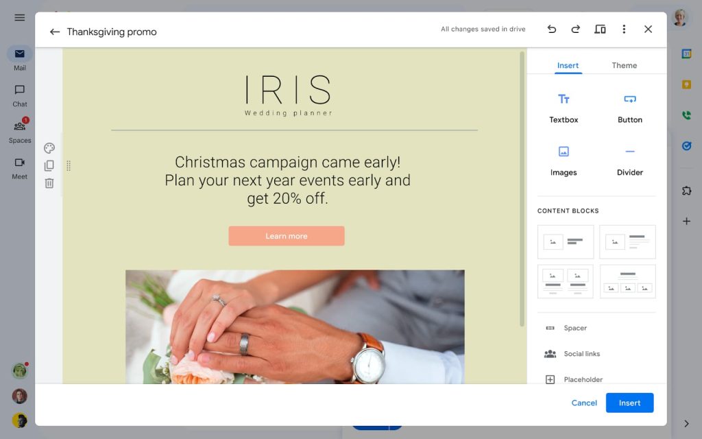 Plus, you can simply drag and drop different sections of an email, making it easier to make changes and move content around. These features will be available to Workspace Individual subscribers in the coming weeks and will launch to other Workspace editions later this year.