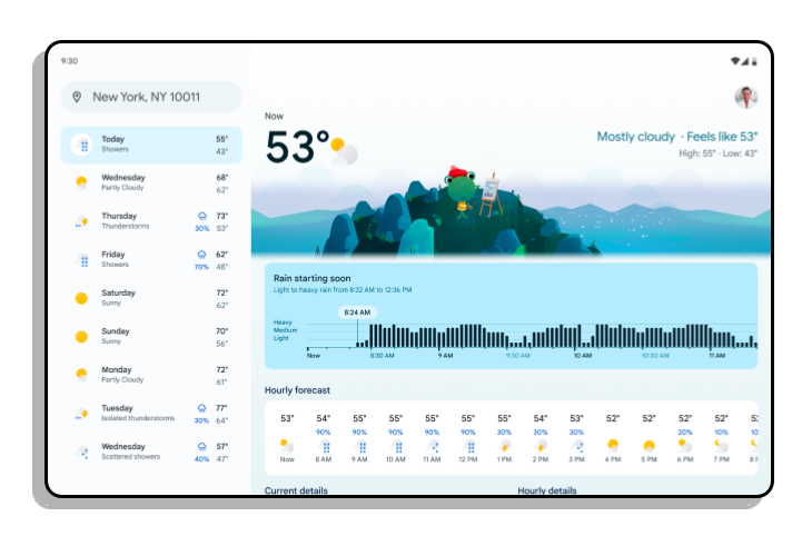 The launch of the Pixel Tablet and Fold also brings a Material You redesign of Google Weather. This revamp, which will later come to other devices, features “Google Nowcast” for more accurate rain, hail, and snow predictions.